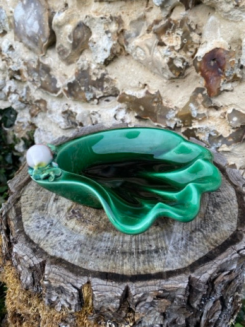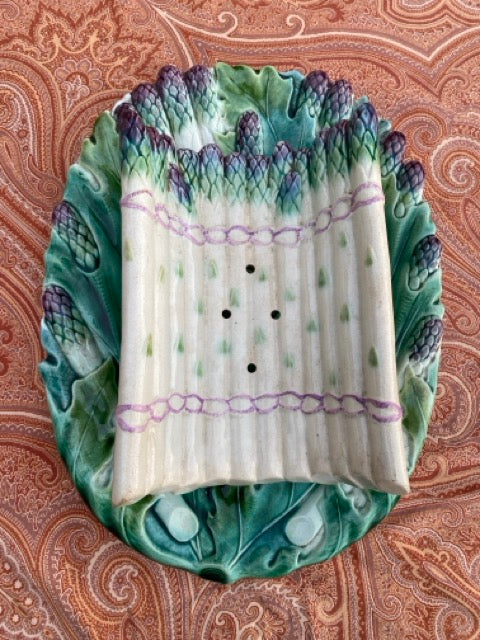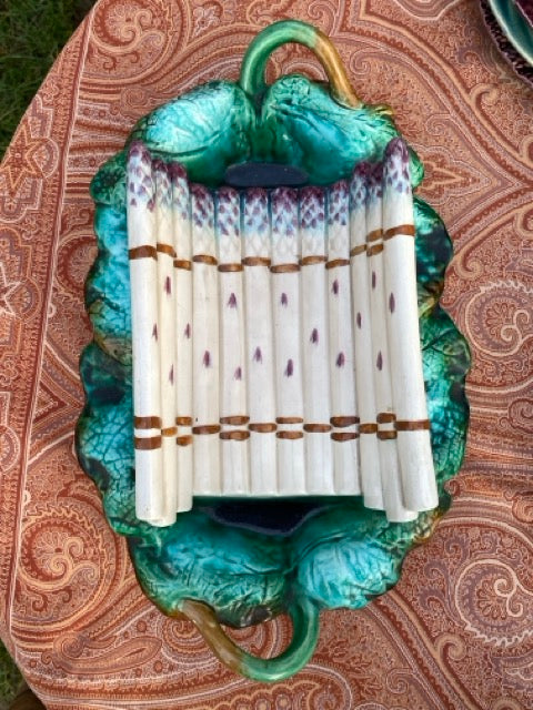 Plat à asperges ancien en barbotine sur sa feuille de chou