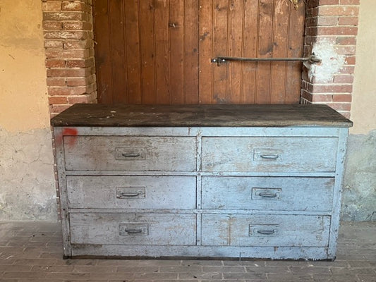 Meuble d’atelier vintage en bois – Chêne et pin – 6 tiroirs – Patine gris-bleu – Longueur 148 cm