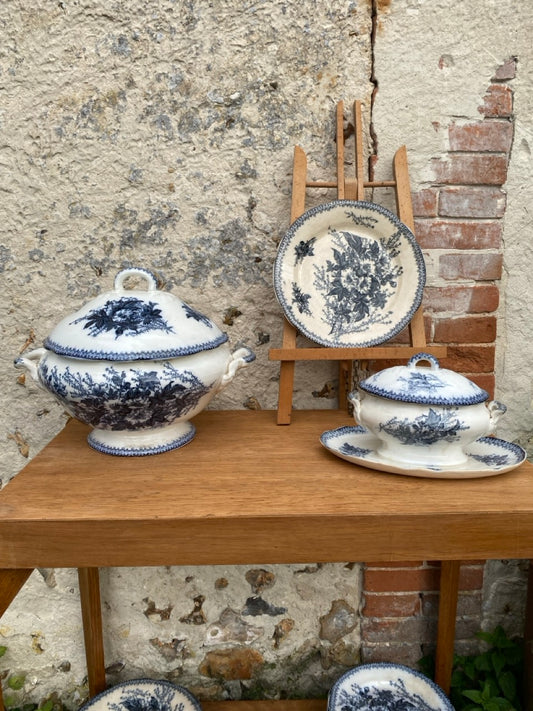 Vaisselle ancienne en terre de fer à décor floral bleu - Faïencerie Onnaing