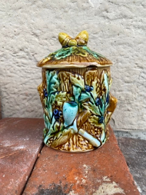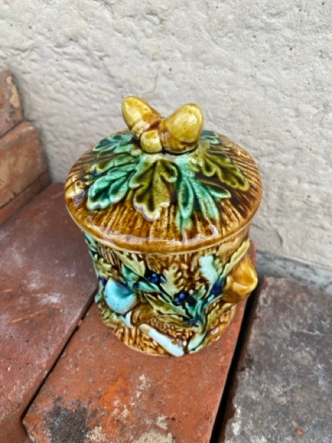 Ancien pot à couvercle en barbotine à décor de feuilles et glands