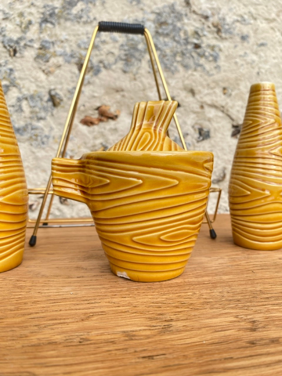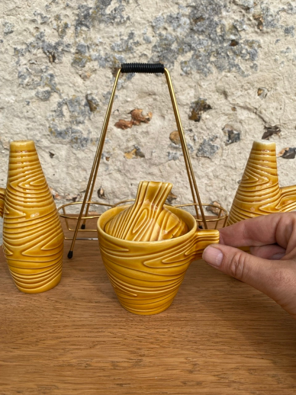 Cet ensemble vintage des années 1950 est un véritable objet de collection pour les amateurs de vaisselle rétro et de décoration mid-century. Il se compose de deux pots à épices (sel et poivre) et d’un moutardier avec son couvercle, le tout en céramique émaillé ocre au décor texturé effet bois.