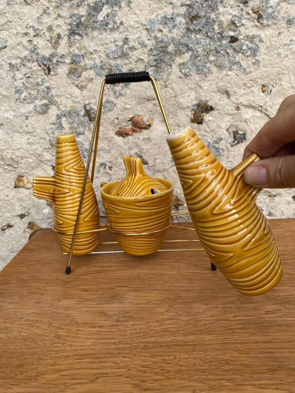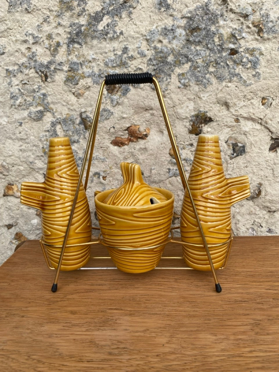 Apportez une touche rétro à votre table avec ce magnifique set sel, poivre et moutardier en céramique jaune des années 50, accompagné de son élégant support en laiton.