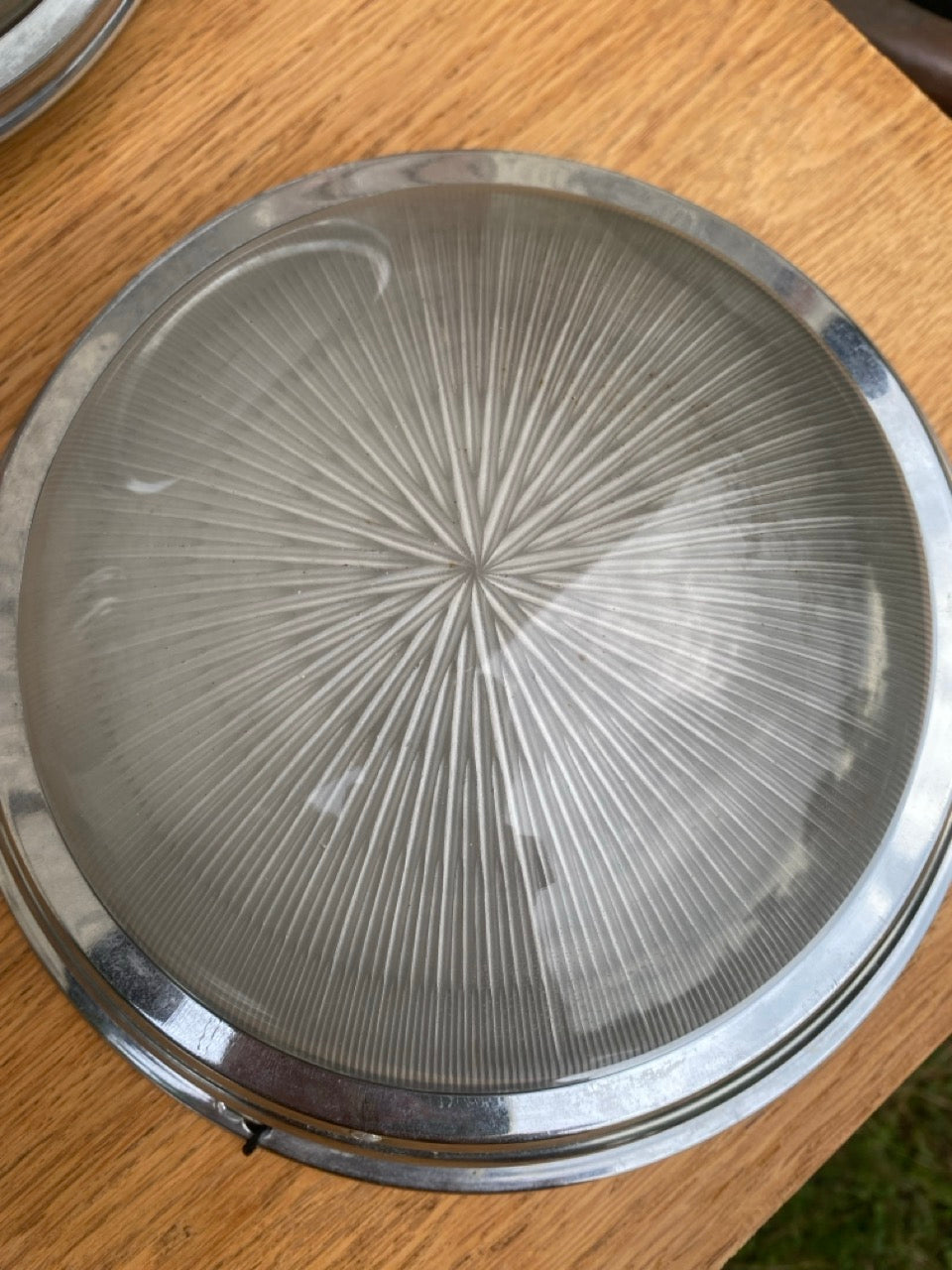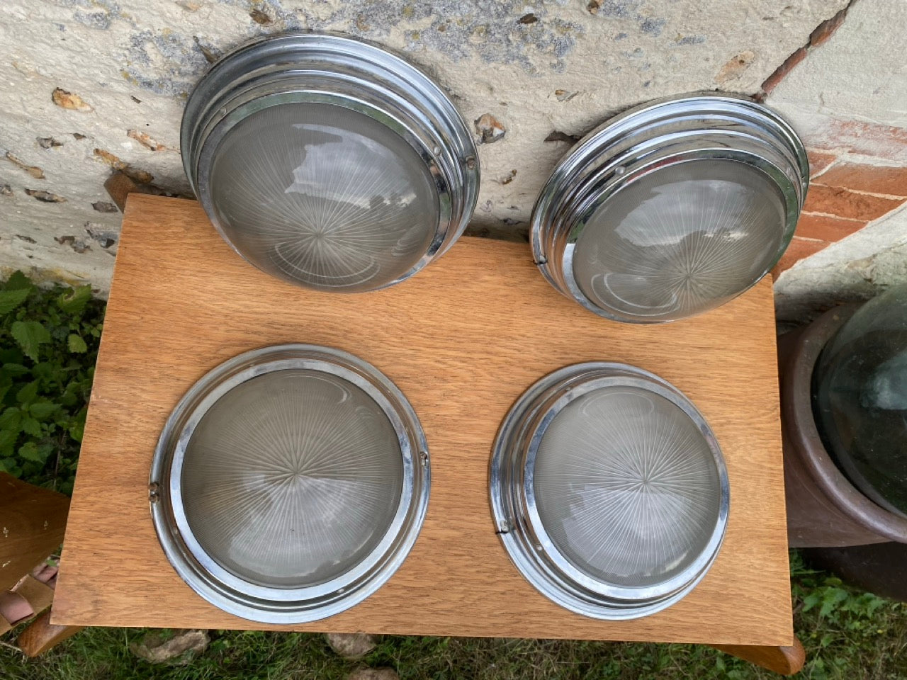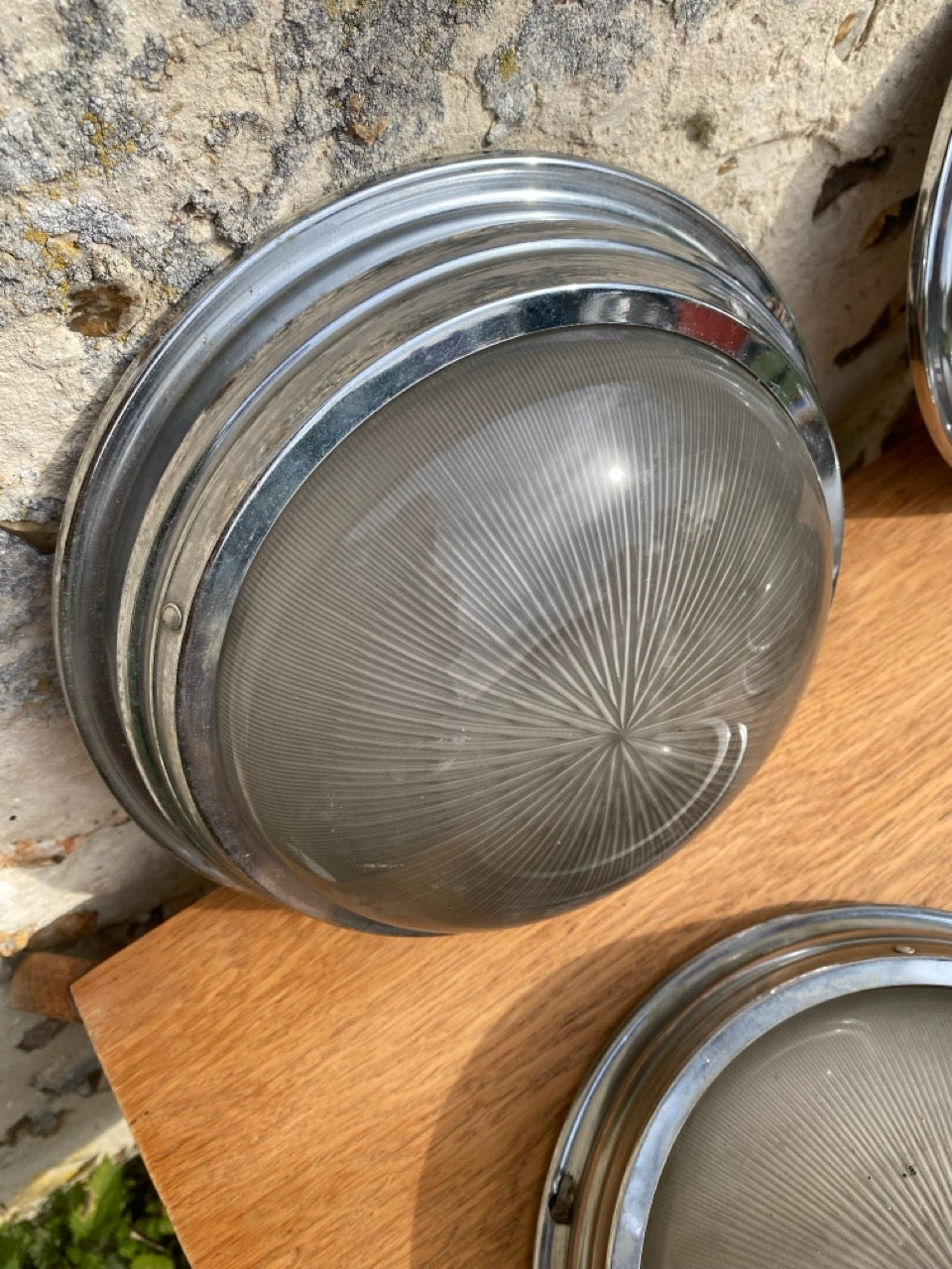 Ces appliques sont fabriquées en verre moulé signé Holophane et entourées d’une monture en chrome poli, offrant un jeu de lumière unique grâce à leur verrerie striée caractéristique de la marque. En effet, Holophane, entreprise française a toujours fabriqué ce type de verres moulés dits « prismatiques » qui permettaient d’éclairer dans une direction donnée. La marque a ainsi produit de la verrerie d’art, pour la décoration, des phares de voitures ou de bateaux ainsi que de l’éclairage public et industriel.
