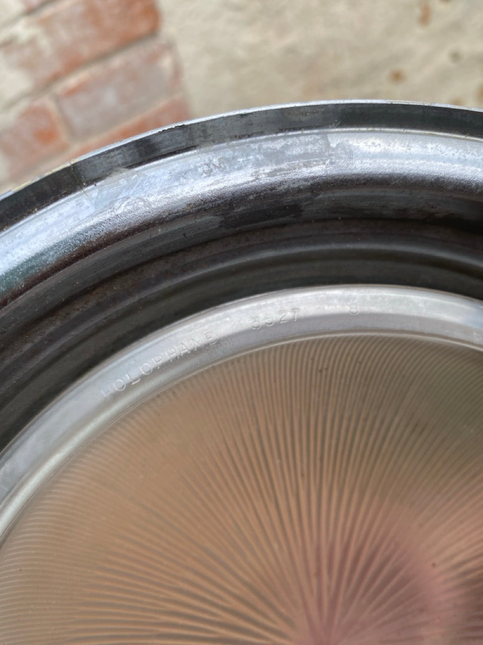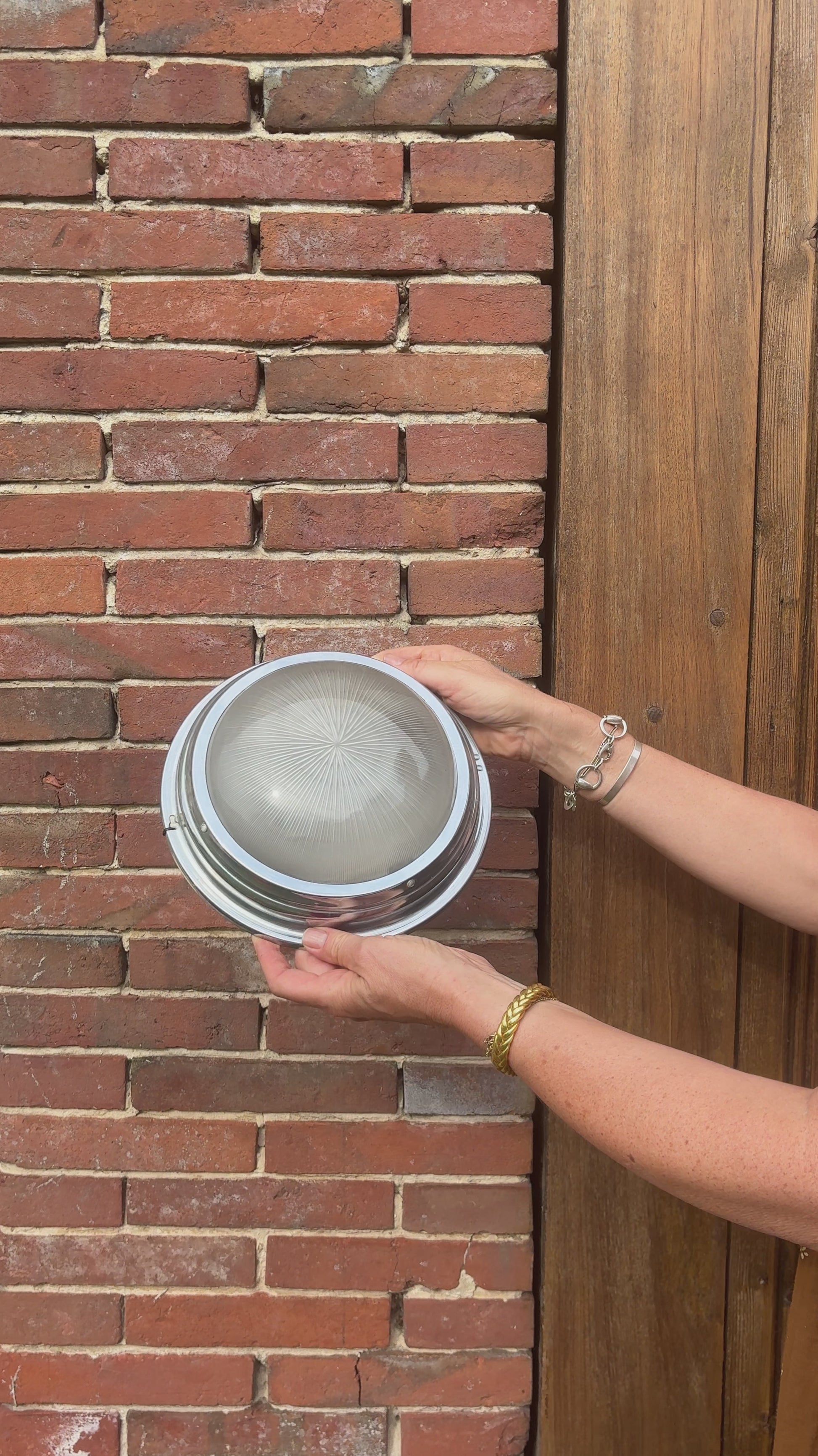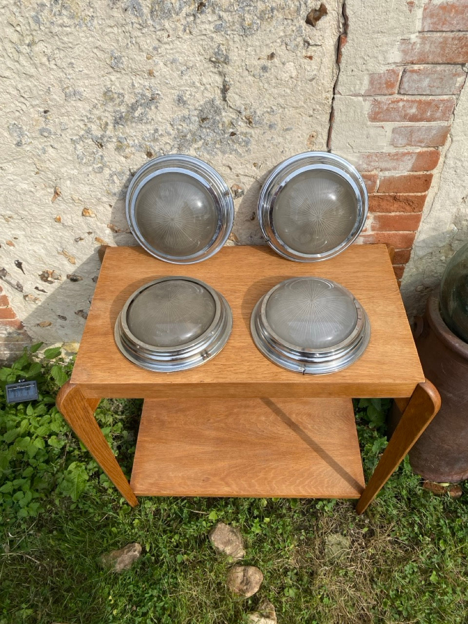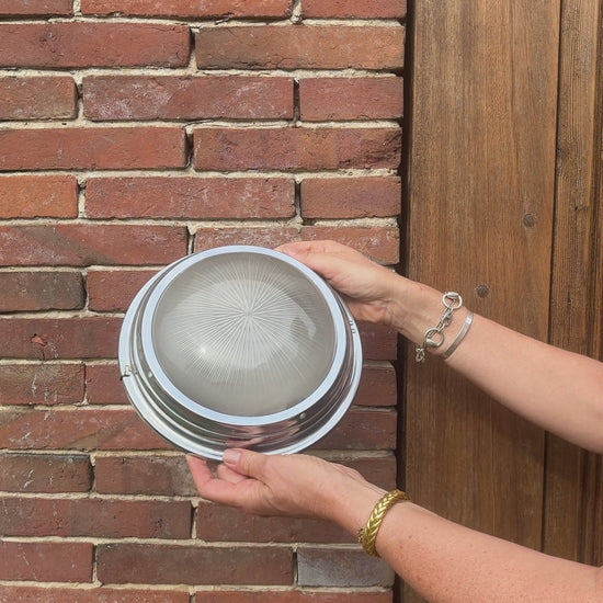 Ces appliques sont fabriquées en verre moulé signé Holophane et entourées d’une monture en chrome poli, offrant un jeu de lumière unique grâce à leur verrerie striée caractéristique de la marque. En effet, Holophane, entreprise française a toujours fabriqué ce type de verres moulés dits « prismatiques » qui permettaient d’éclairer dans une direction donnée. La marque a ainsi produit de la verrerie d’art, pour la décoration, des phares de voitures ou de bateaux ainsi que de l’éclairage public et industriel.