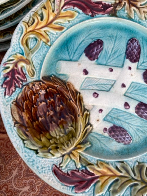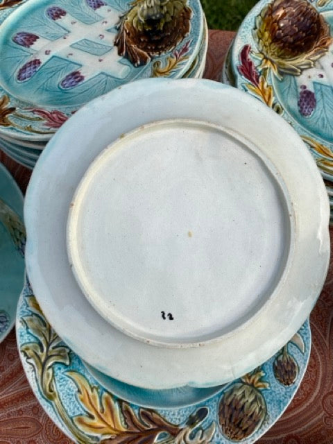 Ce service se compose de 15 assiettes et 2 plats décorés de motifs d’asperges et d’artichauts en relief finement modelés et sublimés par de superbes couleurs bleu, vert, blanc, ocre, bordeaux.
