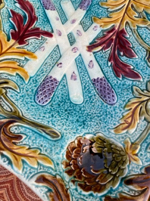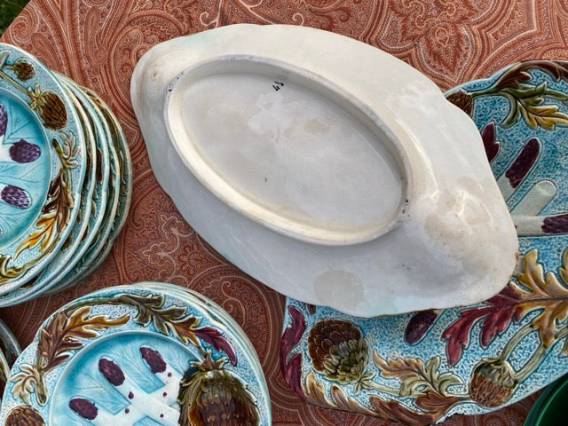 Attention merveille de chez merveille avec cet ensemble de vaisselle en barbotine sur fond bleu ciel éclatant. Décoré d’asperges, d’artichauts et de feuillage ce service ancien typique de la fin du XIXème siècle est une rareté dans un si bel état.